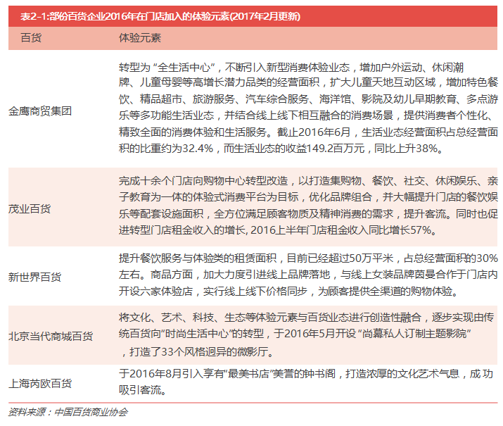 2016年來,各種體驗式消費涌現(xiàn),體驗式消費成百貨業(yè)轉(zhuǎn)型升級的焦點,許多百貨企業(yè)也在門店加入體驗 元素(見表2-1)。與傳統(tǒng)百貨業(yè)相比,場景化、體驗化的百貨商場更能吸引消費者,兒童樂園、餐館、電 影院、超市等已經(jīng)成為購物中心的標配。讓消費者體會更多購物樂趣、提供個性化服務(wù)和商品,成為百貨店 吸引消費者的重要賣點。隨著消費者對商業(yè)設(shè)施的功能性需求和體驗性需求的日益增強,傳統(tǒng)百貨如果不豐 富業(yè)態(tài)將無法留住消費者。
