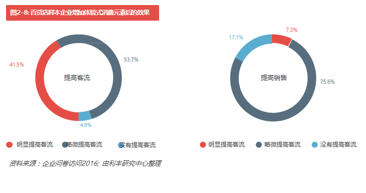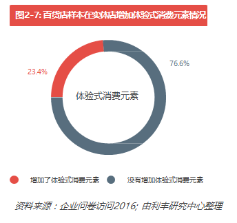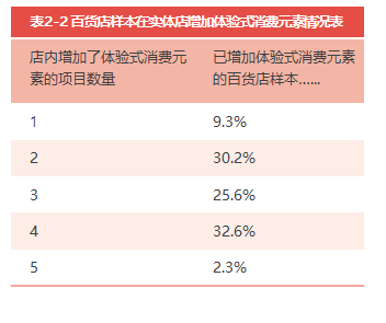 我們的調(diào)查發(fā)現(xiàn),76.6%的受訪百貨企業(yè)已經(jīng)在店里增加了體驗式消費元素(見圖2-7),當中超過9成以上 企業(yè)增加了兩項或以上的體驗式消費元素,如餐飲項目、兒童業(yè)態(tài)組合、娛樂項目等(見表2-2)。