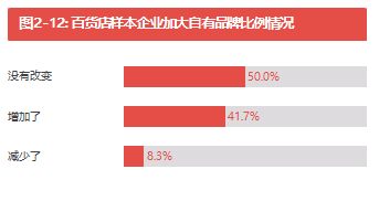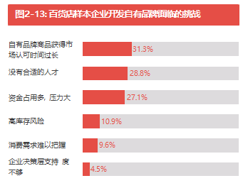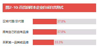 我們的調(diào)查發(fā)現(xiàn),76.6%受訪百貨已經(jīng)采行自采自營模式(見圖2-9)。然而,近62.5%受訪百貨企業(yè)現(xiàn)有 的自采自營比例不到10%(見表2-3)。在開展自采自營的企業(yè)當中,37.8%的企業(yè)采取區(qū)域代理或總代理 的方式,33.3%的企業(yè)采取買斷某一品類或品牌,37.8%的企業(yè)擁有自己的自有品牌(見圖2-10和2-11); 當中超過41.7%的企業(yè)表示過去一年有加大自有品牌比例(見圖2-12)。值得注意的是,受訪百貨企業(yè)普遍 認為開發(fā)自有品牌面臨眾多挑戰(zhàn),31.3%的企業(yè)認為自有品牌商品獲得市場認可時間過長,28.8%的企業(yè)認 為沒有合適的人才去開發(fā)設(shè)計自有品牌商品(見圖2-13)。