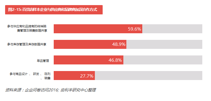 根據(jù)我們的調(diào)查,73.4%的百貨企業(yè)近幾年已積極與供 應(yīng)商和品牌商加深合作(見圖2-14)。在合作的方式中,59.6%的百貨企業(yè)參與供應(yīng)商和品牌商的終端銷售管理及銷售數(shù)據(jù)共享,48.9%的百貨企業(yè)則參與庫存管理及庫存數(shù)據(jù)共享,46.8%的百貨企業(yè)采取單品管理的方式(見圖2-15)。