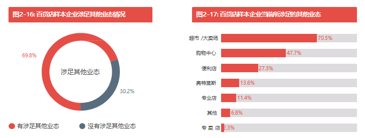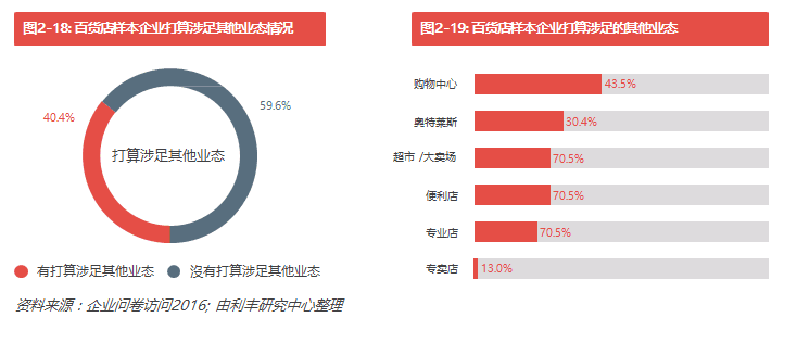 我們的調(diào)查發(fā)現(xiàn),69.8%的受訪百貨企業(yè)已經(jīng)涉足百貨以外的零售業(yè)態(tài)(見圖2-16)。其中,涉足超市/大 賣場及購物中心最為普遍,比例分別為70.5%和47.7%(見圖2-17)。在還沒有涉足其他零售業(yè)態(tài)的受訪 企業(yè)中,有40.4%的受訪百貨企業(yè)表示有計劃涉足其他零售業(yè)態(tài),這當中以購物中心及奧特萊斯業(yè)態(tài)最受關(guān) 注,分別有43.5%及30.4%的百貨企業(yè)計劃涉足這兩種業(yè)態(tài)(見圖2-18及圖2-19)。