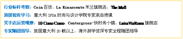 本次活動。我們將在意大利IFDA時尚與設(shè)計學(xué)院,由買手專家?guī)ьI(lǐng)我們深入研修歐美時尚流行趨勢、時尚買手商品訂貨管理技巧等,在旅居意大利二十多年的零售資深人士帶領(lǐng)下,走進時尚發(fā)源地,去發(fā)掘時尚背后真正的美學(xué)氣質(zhì)和匠心精神。