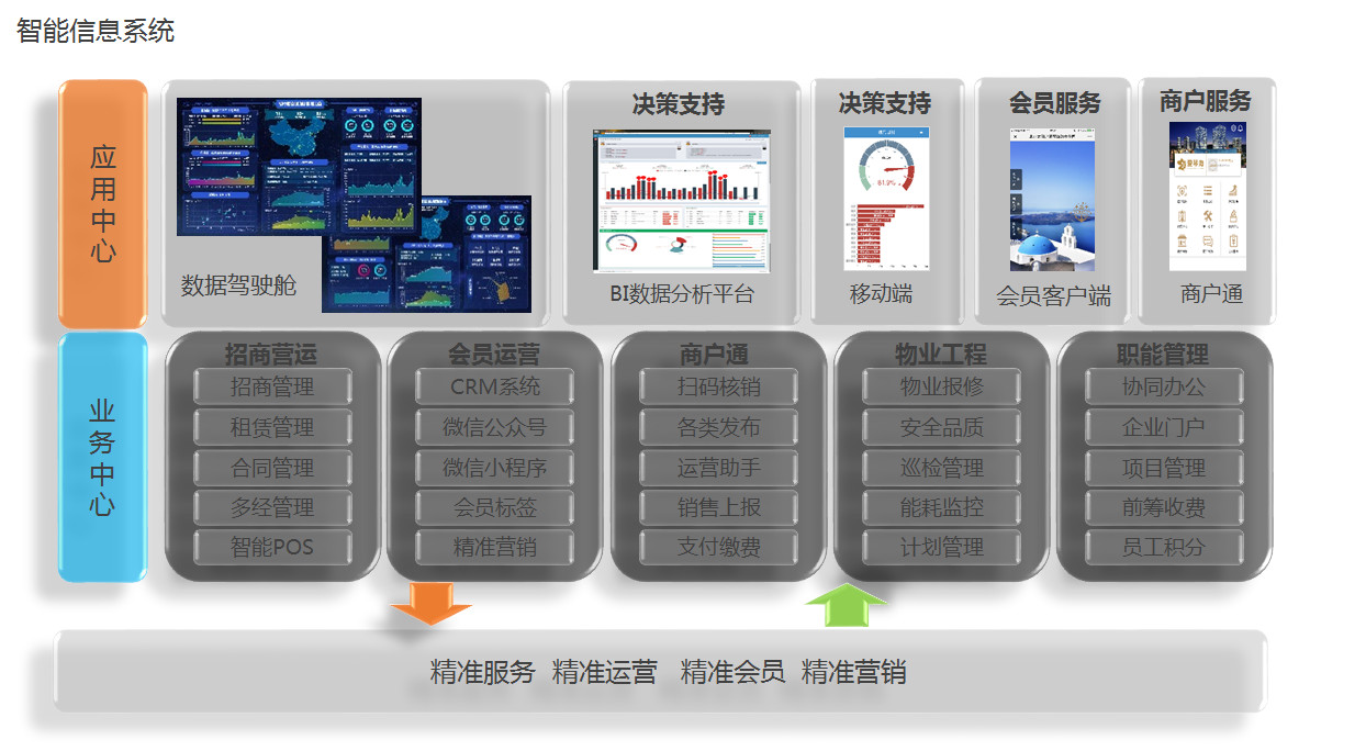 第二部分我給大家介紹我們在運營期,在運營期其實技術和五我們原來的百貨也好,超市也好,最早的技術應用相當于是管理,大家也都發現,不管是我們做企業內部的OA審批系統,合同管理系統,最早全是這樣的系統管理,慢慢會有消費者之間的VIP的管理,到現在這些邊界完全打通,所有的人確實都在線上了,你的員工、廠家的員工可以建社群,這個社群可以跟你的購物中心的VIP連在一起的,商戶的商品,你自己的VIP的禮品都是完全可以上線的,他可以變成一個電子的幾元店,整個信息系統,我們是不斷在完善我們的數據,我們也有一個中央處理中心,從管理到商戶到消費者都融在一起,然后我們再推出不斷往外延展去影響我們的動作。
