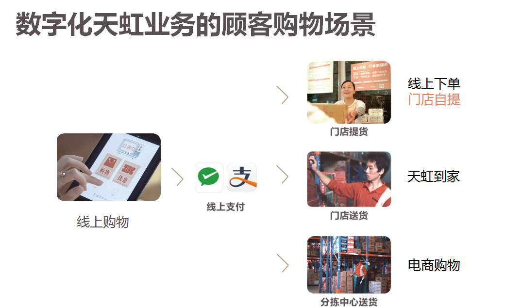 數字化就是說我們構建了新的購物場景,如果顧客到店里消費的話,我們可以由幾種支付方式,現在我們天虹96%到98%已經實現了專柜會員端直接收銀,超市也完成了自助收銀和手機收銀,顧客也可以到店馬上拿走,實體店也可以送貨,同時我們百貨商店的云店也可以為顧客提供服務。就是滿足顧客在不同的場景下的利用線上紅領巾的平臺實現顧客各種場景下的服務。