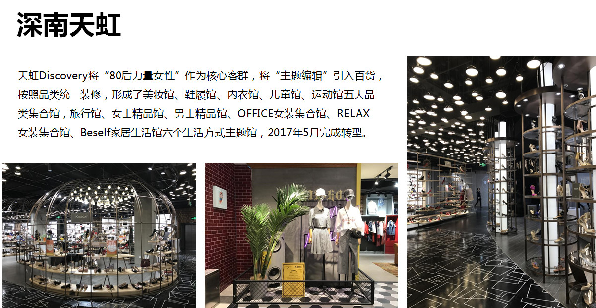 深南天虹大家也知道,其實在一個傳統的老的天虹百貨,地處的位置比較好,是深圳華強北的商圈,我們打造了一個以80后力量女性為主的,我們首次嘗試主體編輯,將主體編輯納入百貨,這個是基于跟日本百貨的學習。我們把一些品類進行了整合和統一裝修,形成了美妝館、鞋旅館、內衣館、兒童館、運動館,同時考慮女性的消費特征不同的生活場景打造了OFFICE館、RELAX館,休假獨家的時候穿什么,上班的時候我的包、我的服飾、我的飾品,是基于生活場景進行打造的。在這樣獨體下,我們發現在顧客效率也很高,同時在很多區域設計上也得到行業肯定。這也是我們首次把主題編輯引進了百貨。