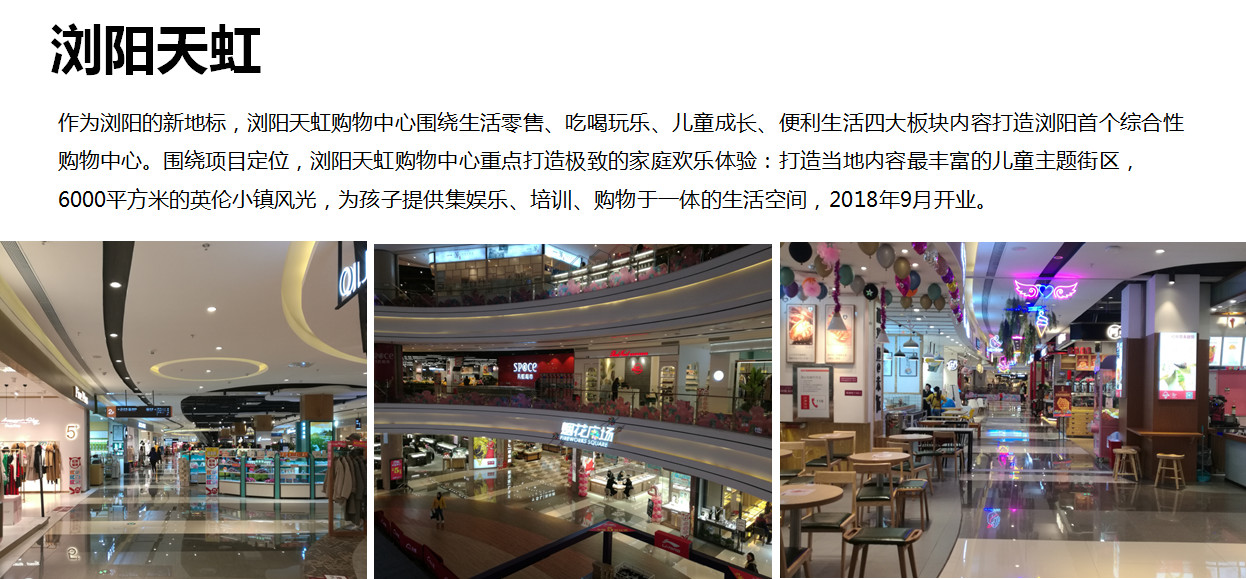 這是我們2018年9月份開的一個在縣級城市的商城——瀏陽商場,一開就非常火爆,成為瀏陽新的一個地標,面積其實不會很大,但是在這樣一些四線城市、三線城市位置上,我們打造吃喝玩樂購,把我們兒童成長,生活零售體驗的模式,打造了一個小型的購物中心。在這樣一個業態情況下,我們認為在四線城市還是有非常好的生命力,因為我們的實踐已經證明了,包括我們打造了兒童的英倫小鎮,我們從孩子的教育、娛樂、購物一體做了一個非常好的組合,也就是說我們現在探索出來在四線城市的小型購物中心滿足城市的購物需求上,我們找到了一些方法。