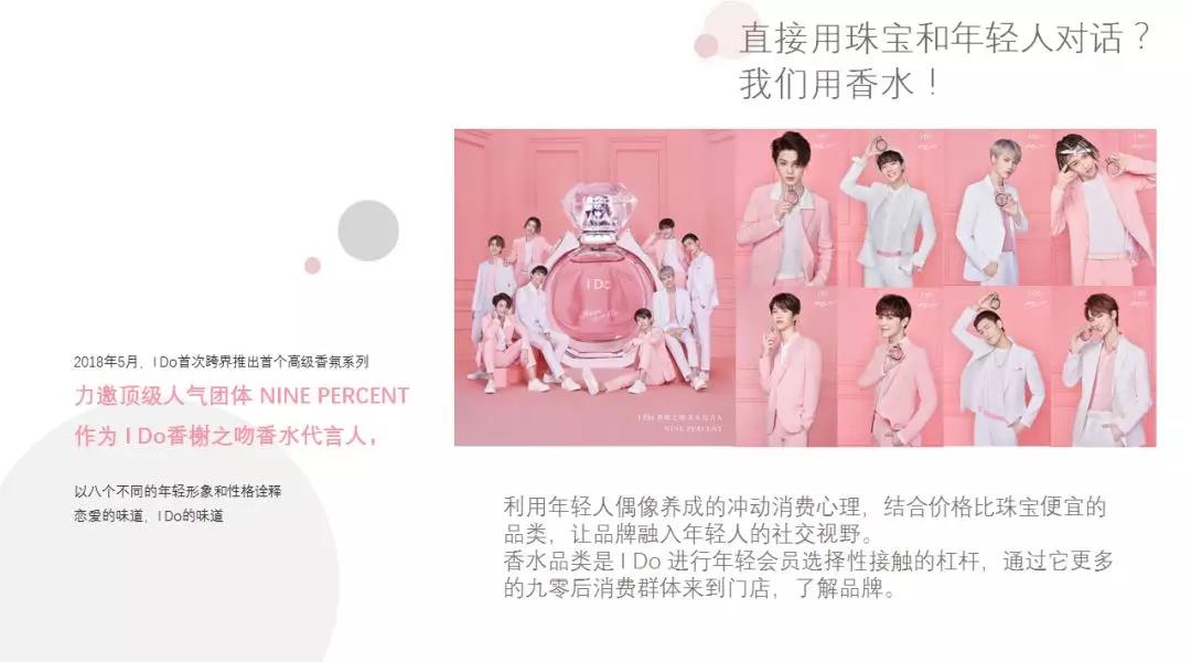 70后、80后的消費者還是貨比三家,看看合不合適,再問問身邊的朋友怎么樣,90后完全不是這個概念,他的思維過程完全延續,知道你了,沒問題,喜歡了就ok,不喜歡沒用。所以這樣一個分析,我們也想通過一些年輕的接受方式,把年輕者給抓過來。所以我們2018年和團體合作了,因為粉絲經濟,我們發現這個很火,可是我們有個問題,我們做婚戒的,這東西很重,我們怎么拿產品跟年輕者接觸呢,因為我做任何一個活動都要有一個產品承接它,我拿婚戒、對戒都不合適。珠寶里做婚戒的專業,我可以這么說,因為我們是國內珠寶行業唯一有設定的品牌,我們找一個差異的,找化妝品,可是化妝品里面,很多快銷。所以我們找香水,香水本來就是一個快銷品的耐銷品,怎么樣讓年輕人買它,這個時候希望說(英)永遠在你身邊環繞,任何時間都能感受到我的好,我們選了一個香水,因為味道是人的本能之一,是嗅覺,我希望你能聞到我,看到我,所以用了香水。我們說愛味道,這個話題,所以用香水跟年輕消費者對話,讓年輕消費者知道我們。