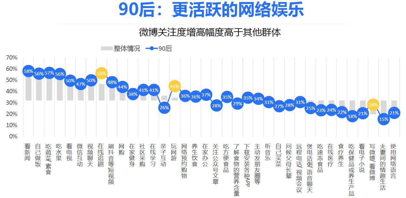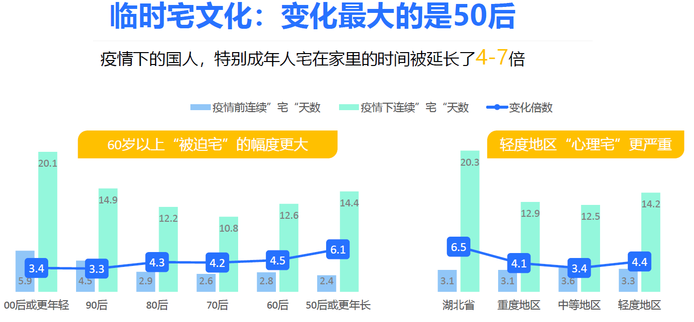 臨時宅文化之下變化最大的當屬50后,不僅養成使用網絡的習慣,在家健身這一習慣養成率也高于其他群體。 00后偏向更活躍的網絡行為,90后偏向網絡娛樂、80后更多的是親情和情趣,70后更多的特征表現為微信互動。