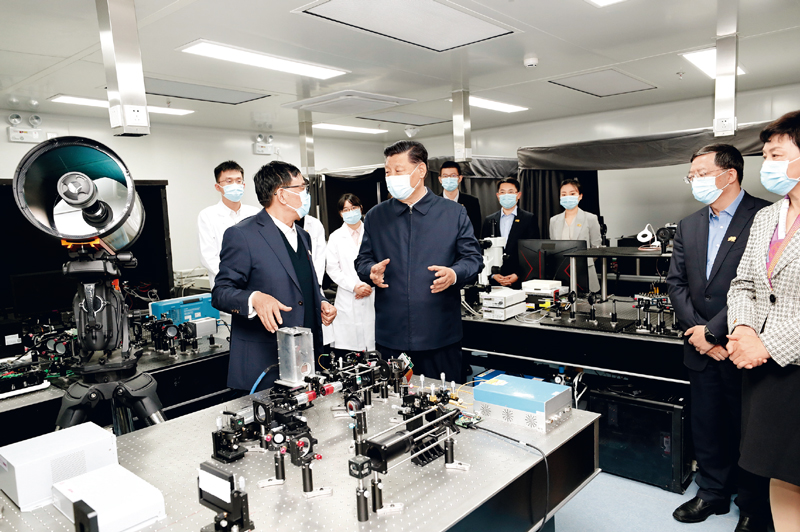 2021年4月19日,在清華大學(xué)建校110周年校慶日即將來(lái)臨之際,中共中央總書記、國(guó)家主席、中央軍委主席習(xí)近平來(lái)到清華大學(xué)考察。這是習(xí)近平在清華大學(xué)成像與智能技術(shù)實(shí)驗(yàn)室同師生們親切交談。新華社記者 黃敬文/攝